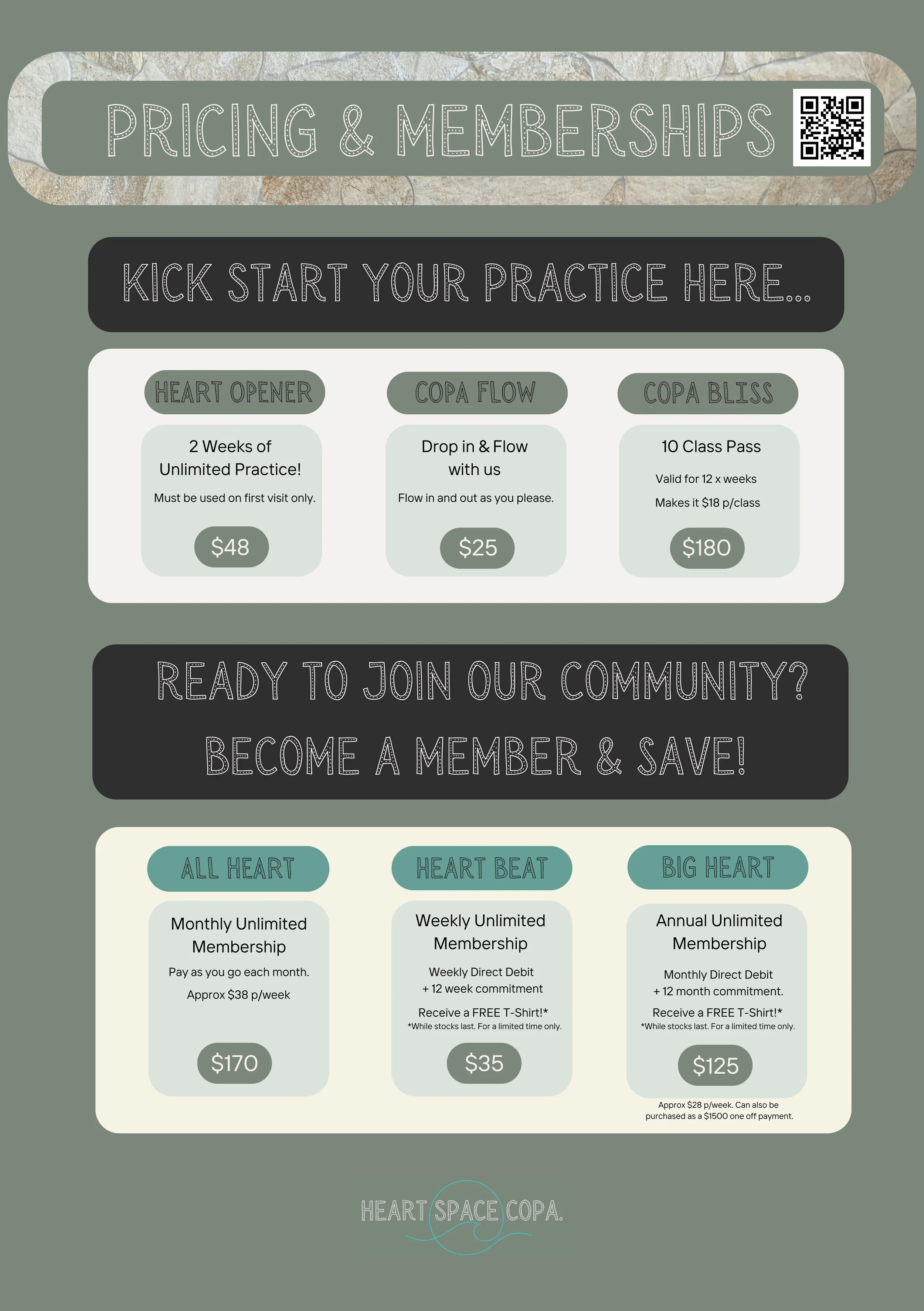 The smartest way to save & invest in your practice is with a Membership. Enjoy the best value and unlimited practice - whether you opt for a Monthly ‘ALL HEART’, a weekly ‘HEART BEAT’, (direct debit option so you don’t even need to think), or an annual ‘BIG HEART’ pass to take advantage of the most cost-effective option AND keep you showing up for yourself!